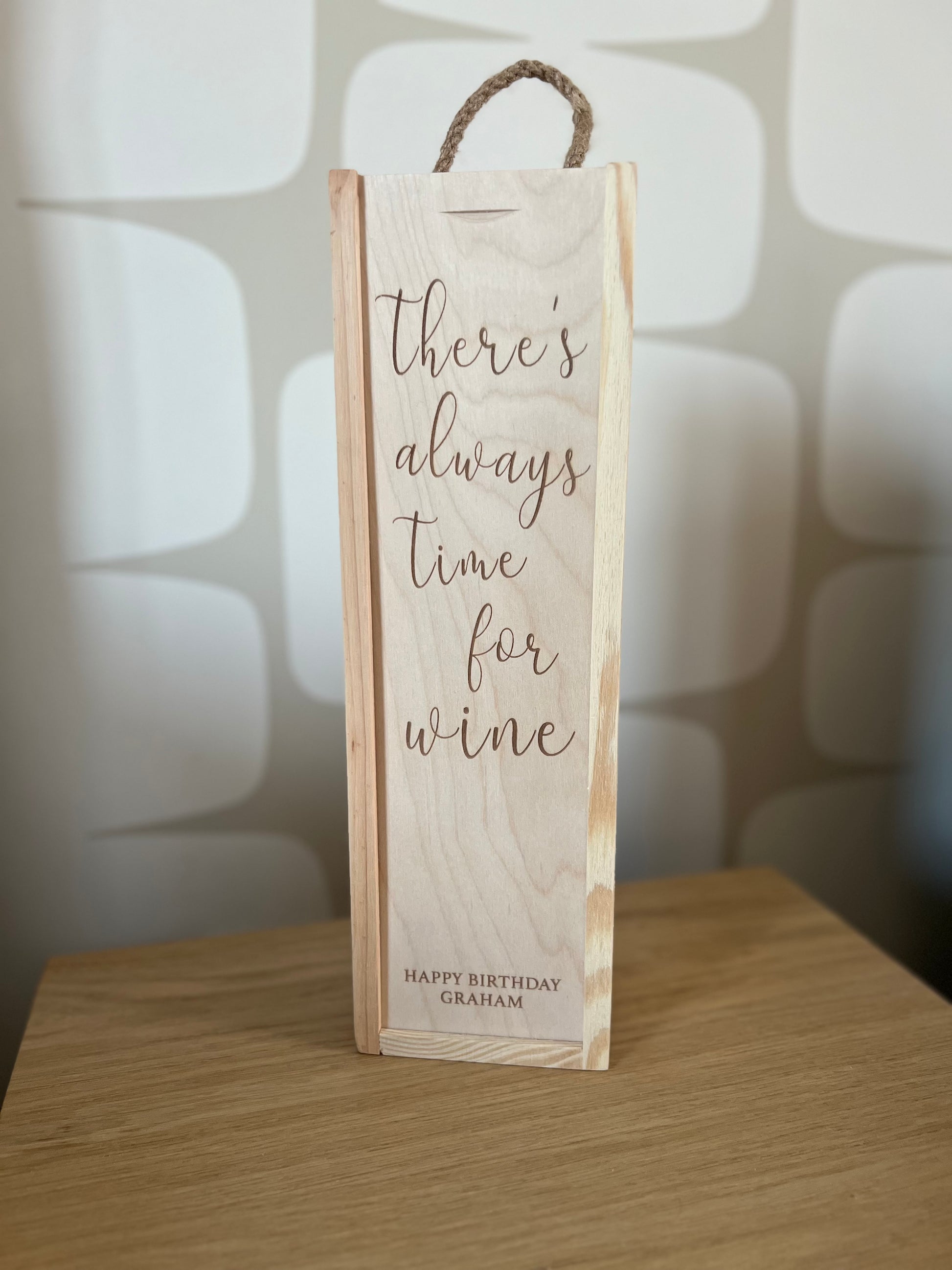 Personalise our wooden wine boxes with a message of your choosing. Our boxes say 'there's always time for wine'. your message will be engraved at the bottom of the box.
